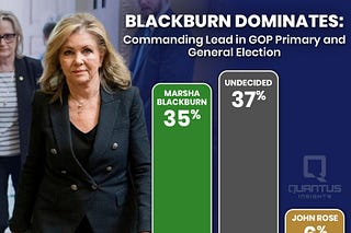 Quantus Insights Polling of 600 registered Tennessee voters, August 5–7, 2025, shows Marsha Blackburn as the dominant GOP frontrunner in a deeply…
